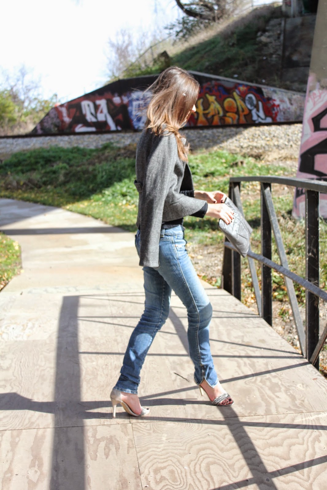Personally I prefer wearing pants instead of dresses, neutral colors, over brights, and flats instead of heels. But the combination of jeans and heels together is one of my all time favorites, though I don’t get a reason to wear them together too often. Feeling inspired by my recent sprained wrist (splint not shown), I decided to keep Sunday’s outfit simple with jeans an a blazer.