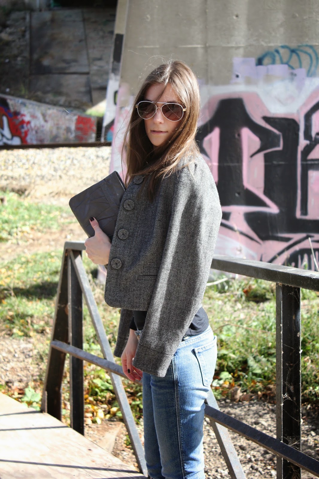 Outfit Details: Forever21 Top / Banana Republic Blazer / Old Navy Jeans / Kenneth Cole Sunglasses / Vintage Letisse Clutch / Steve Madden Sandals (similar here)