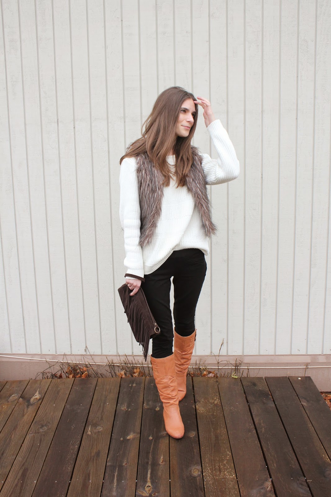 Outfit Details: Tommy Hilfiger Sweater (similar here) / Tiff Fax Fur Vest / Gap Pants / Old Navy Clutch / Steve Madden Boots (similar here) / Essie ‘Chinchilly’ Nail Polish