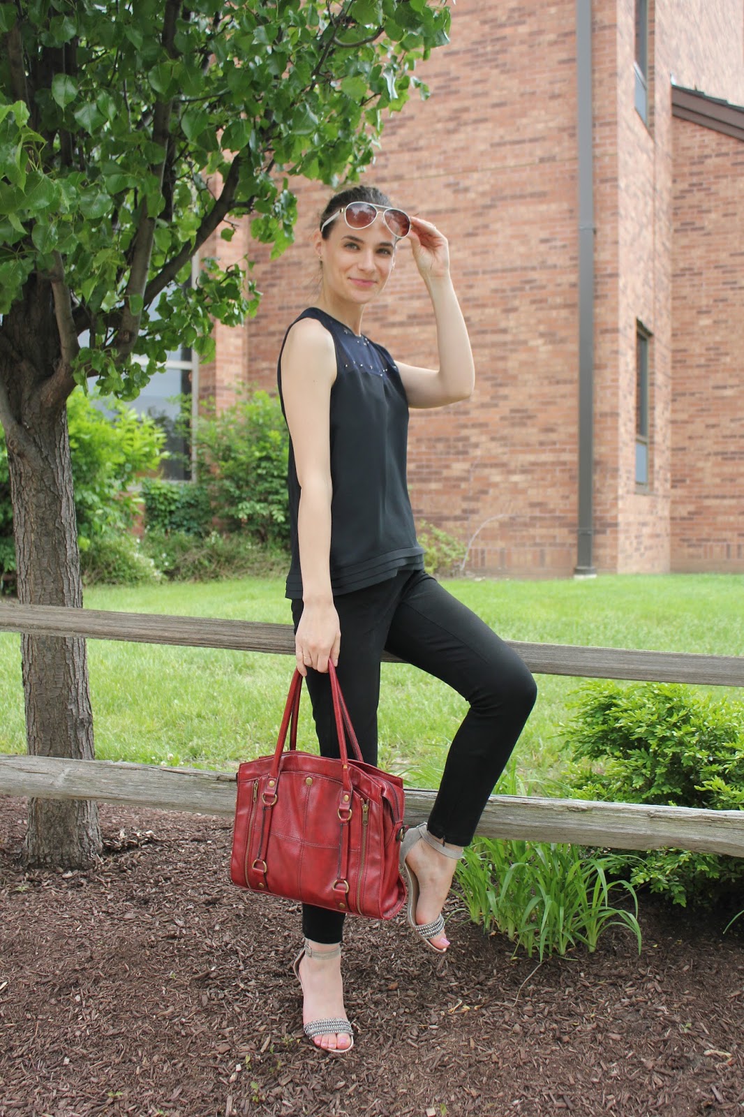 In honor of Memorial Day I pulled together a patriotic look. A navy and black top with little silver stars at the neck and bust line paired with a red bag.