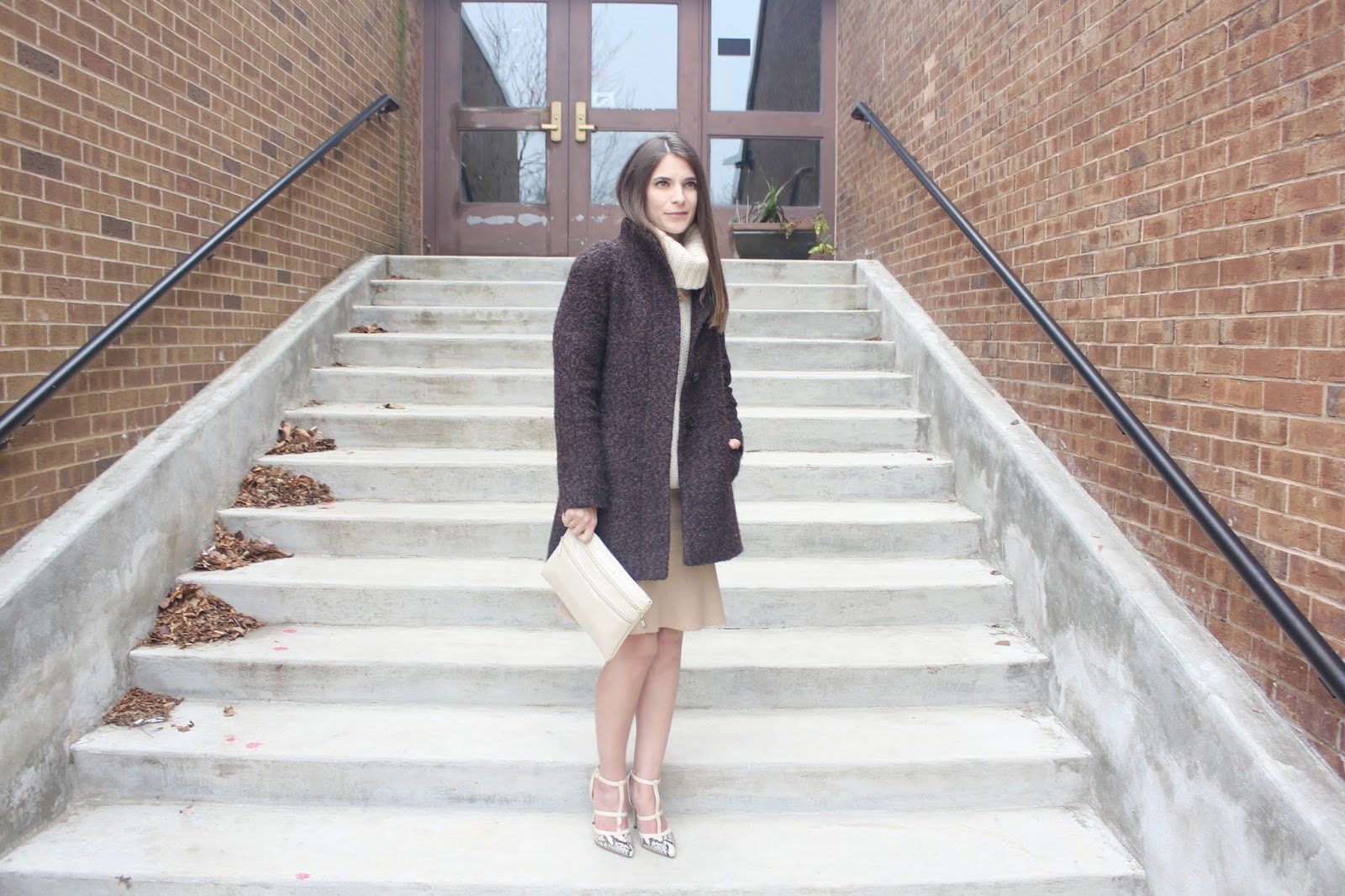 Outfit Details: J.Crew Turtleneck (similar here) / Gap Skirt (similar here) / Ann Klein Coat / Steve Madden Heels (similar here) / Jones New York Clutch (other colors here)