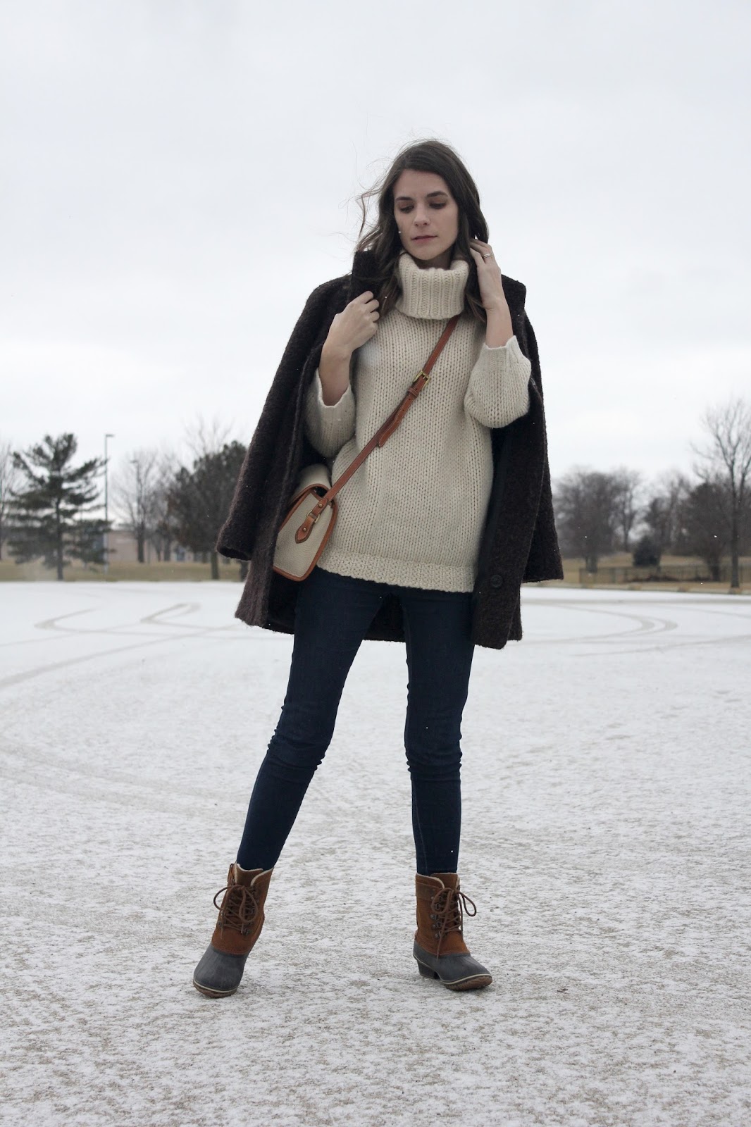 I woke up to heavy snow fall (although it doesn’t look like much here) last Sunday, and my main concern switched from looking cute, to staying warm and dry. I switched out my suede ankle booties for Sorel duck boots, and layered in a chunky knit sweater and wool coat.
