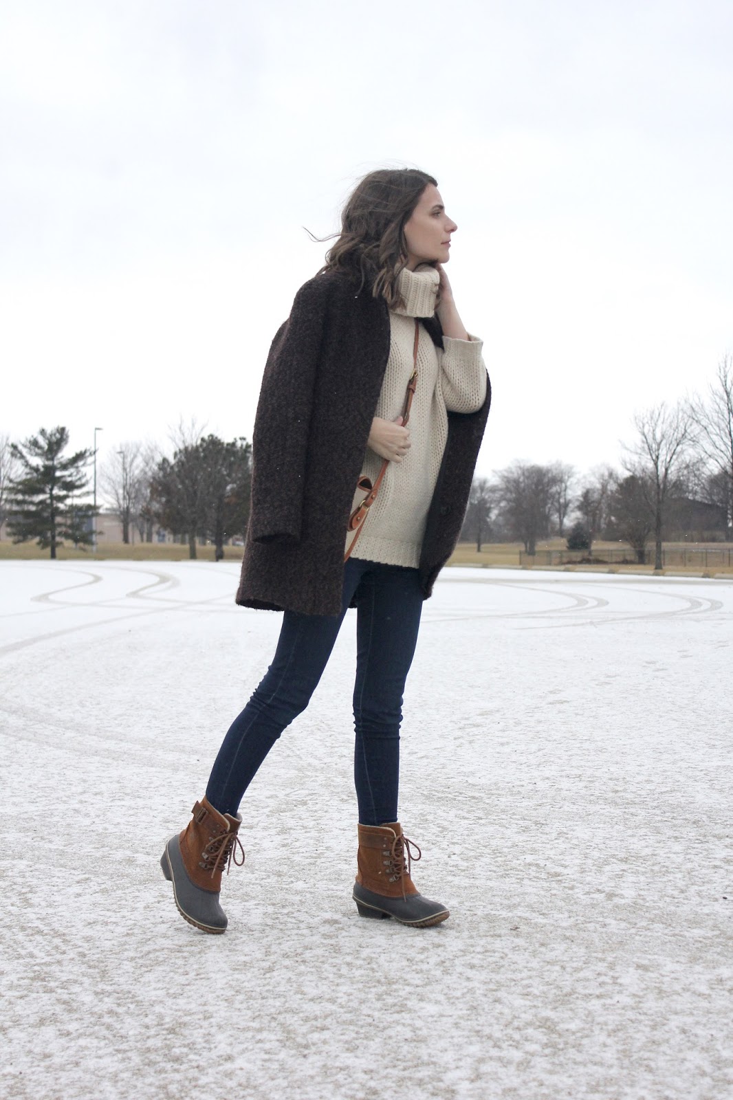 I woke up to heavy snow fall (although it doesn’t look like much here) last Sunday, and my main concern switched from looking cute, to staying warm and dry. I switched out my suede ankle booties for Sorel duck boots, and layered in a chunky knit sweater and wool coat.