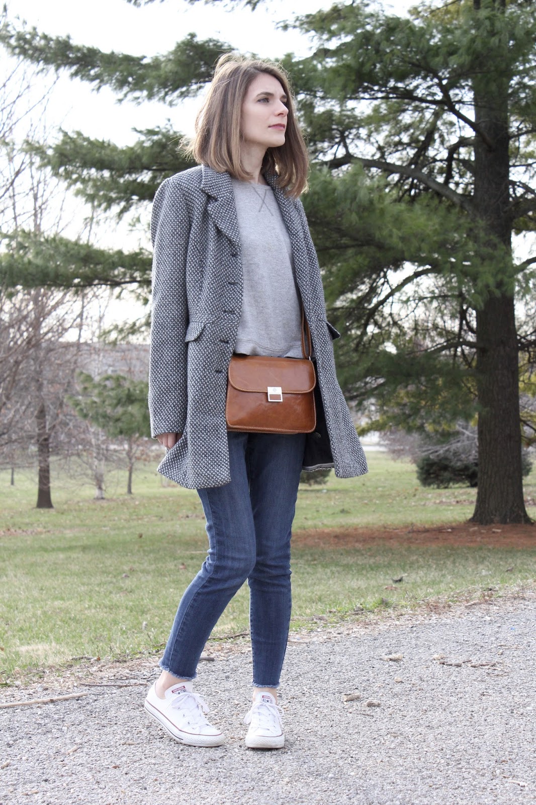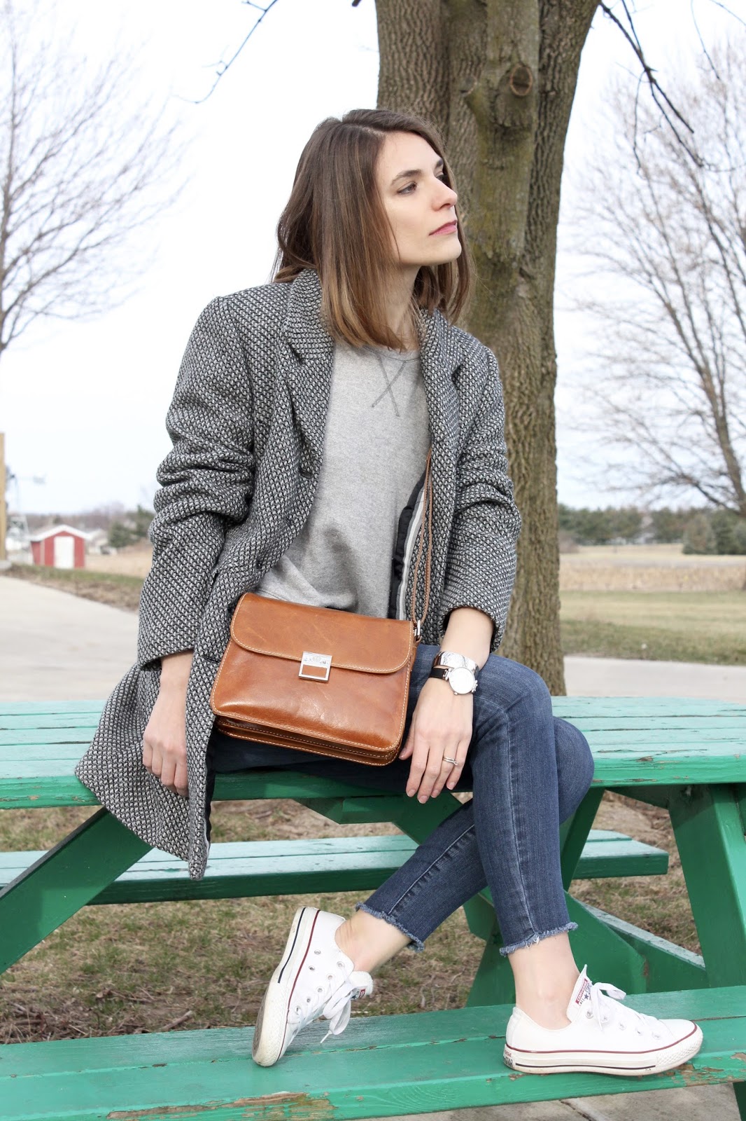 Outfit Details: Dialogue Coat / Urban Outfitters Sweater (similar here) / Blue Spice Jeans (similar here) / Converse Sneakers / Giani Bernini Bag / Anne Klein Watch