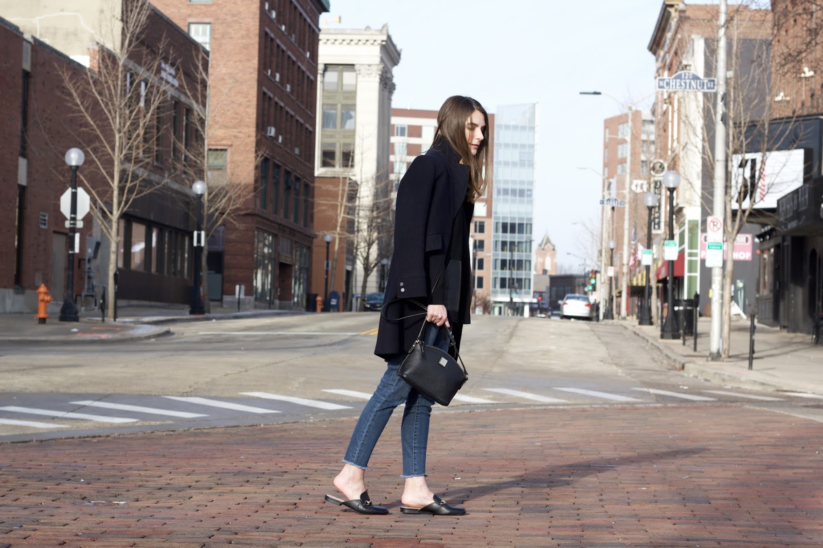 Outfit Details: Asobio Collection Coat (similar here), J.Crew Sweater, Blue Spice Jeans (similar here), Dooney & Bourke Purse c/o, Target Mules (on sale for under $12!)